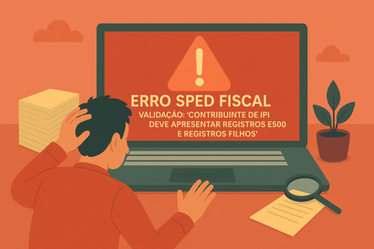 Ao validar o SPED Fiscal no PVA, muitos profissionais se deparam com o seguinte erro: Validação: “Contribuinte de IPI deve apresentar registros E500 e registros filhos.” Esse erro costuma causar dúvidas porque, em muitos casos, o contribuinte não apura IPI, não teve movimentação com esse imposto no período ou acredita que o cadastro já reflete…