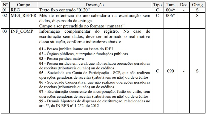 O Registro 0120 é específico para a pessoa jurídica informar o mês ou os meses do ano-calendário em que está dispensada da apresentação da EFD-Contribuições.